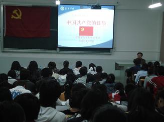 党校工作实施细则》。学生党支部书记王腾飞宣读了党校教学课程安排,并且由党支部宣传教育工作组组长王稼祥宣读党校学员分组名单及小组负责人。之后, 0911公共事业管理专业龚雪燕同学作为第三期党校新生代表进行发言,她向同学们号召到:“党规定我们要做的事,我们一定做到;党禁止做的事,一定不做。”她还倡导同学们要为成为一名合格的党员而不懈努力。开学典礼结束后,党校第一课正式开讲,张校长作为党校第一课的主讲老师。在课堂上,他对入党积极分子提出四点希望:第一,要坚定党的信念;第二,要掌握科学理论,树立正确的世界观、人生观、价值观;第三,要增强创新意识,适应时代的要求;第四,要遵守纪律,提高学习的效率,做一个有利于社会主义现代化建设的人才。